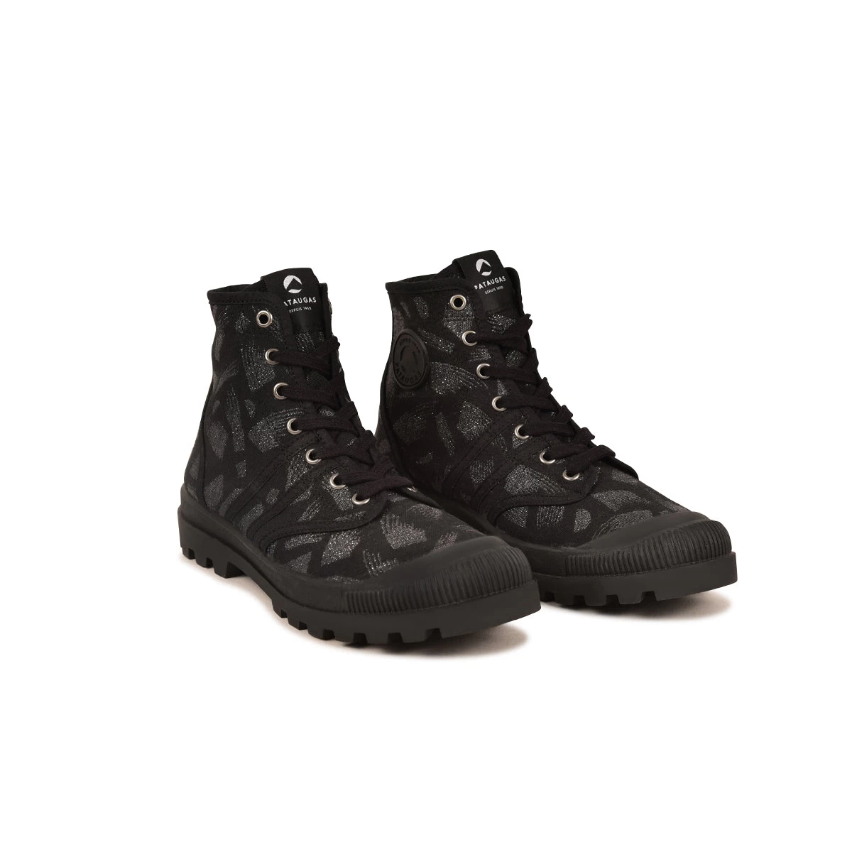 La boots en toile montante pour femme Authentique se pare d’une toile à motifs noirs modernes. Légèrement irisée, cette toile tissée en France est également robuste et légère. Cette chaussure a été assemblée par un processus de vulcanisation dans nos ateliers espagnoles.