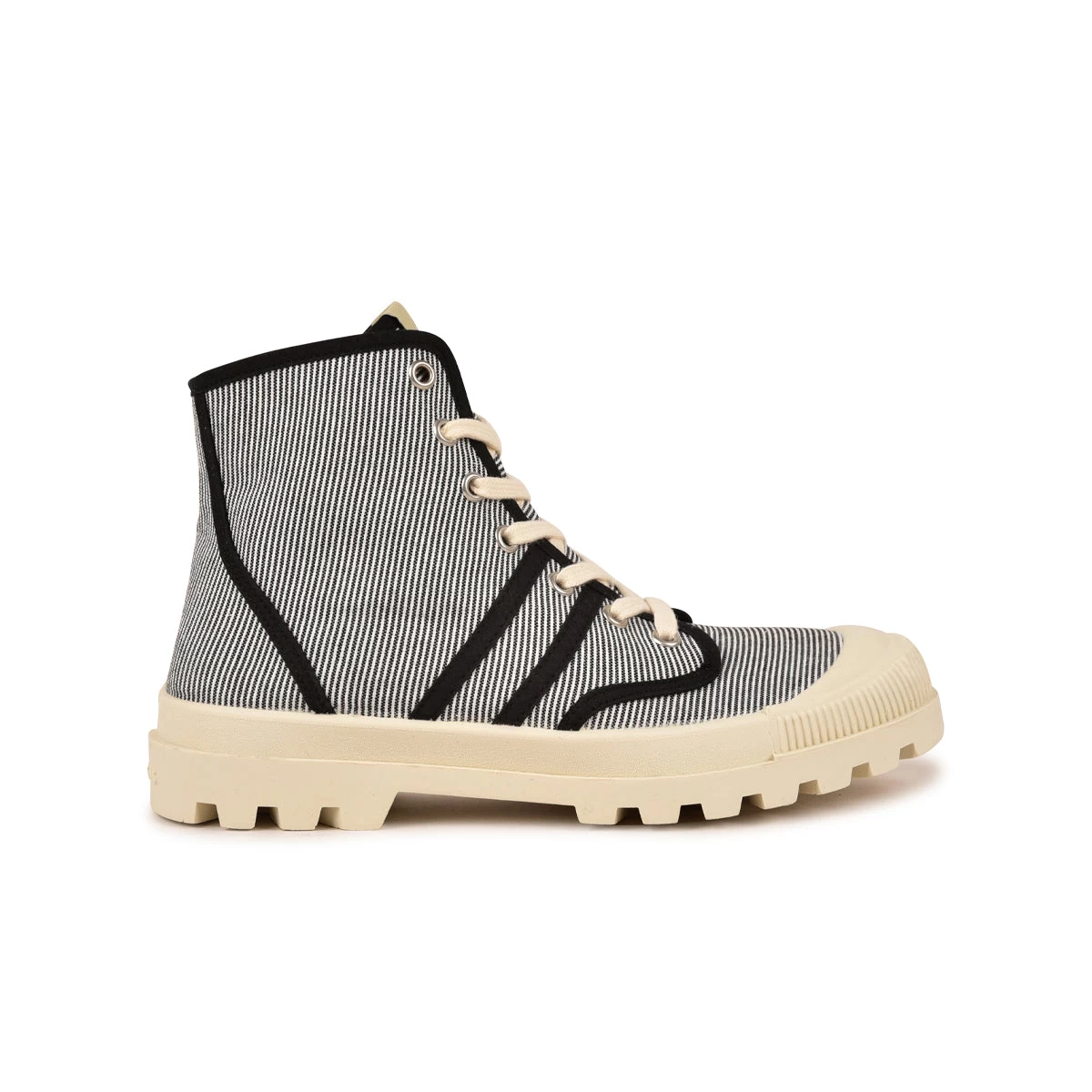 Découvrez la version de la boots Authentique, notre chaussure en toile iconique depuis 1950. C’est une boots munie d’une tige rayée noir et blanc très robuste montée sur une semelle crantée flexible et très souple. C’est une chaussure pensée et designée en France puis fabriquée dans nos ateliers en Espagne.