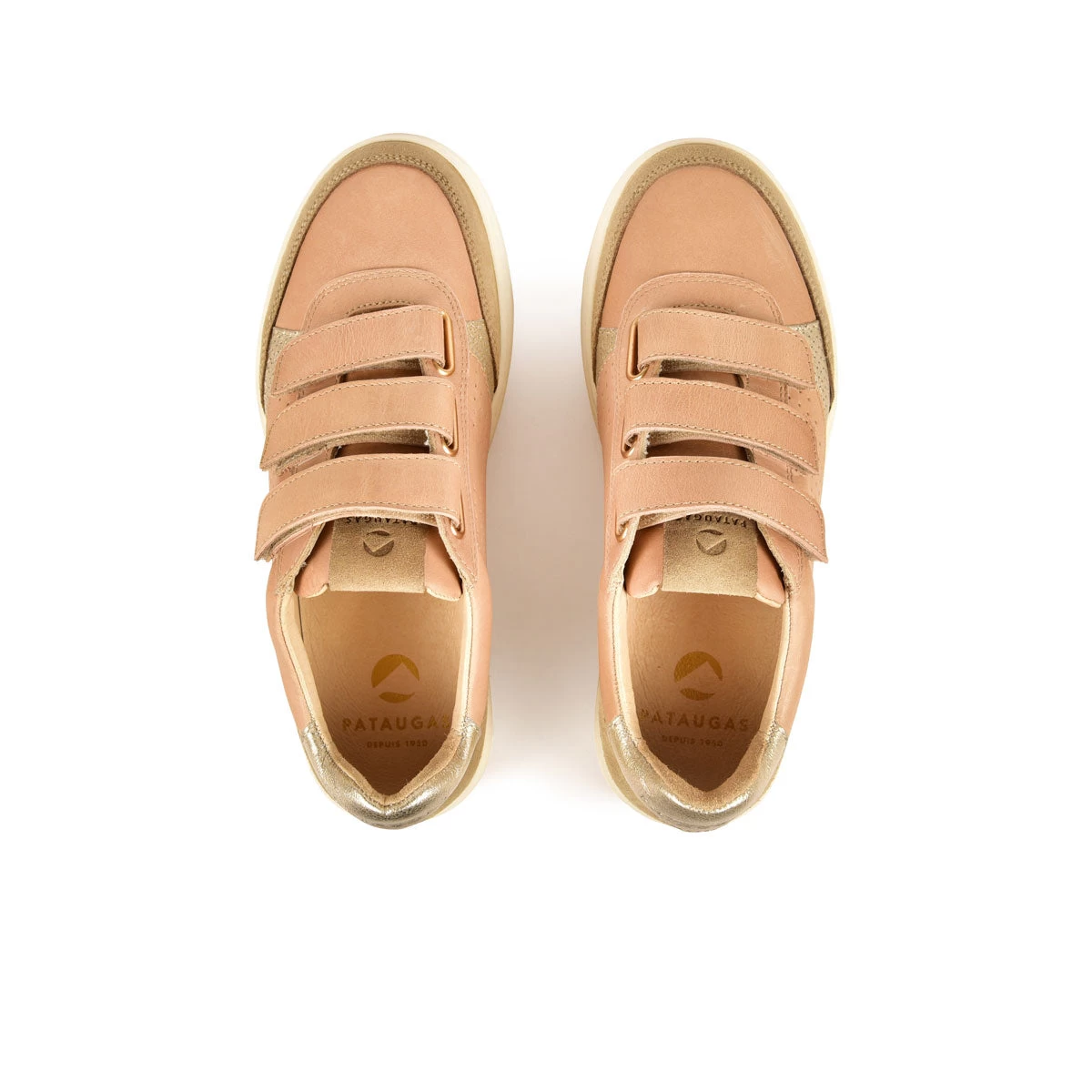 Nouvelle création Pataugas, la nouvelle version de notre basket basse femme Basalte coloris beige/doré. Une basket basse femme facile à chausser et à porter au quotidien, sans jamais se lasser. Son cuir blanc et sa touche doré métallisée donne à notre Basalte, luminosité et élégance. Elle est montée sur une nouvelle semelle en caoutchouc naturel plus épaisse qui apporte le côté moderne et un grand confort pour vos marches quotidiennes. Cette version à scratch, sportwear et féminine à la fois, se décline en rose, écru ou doré. C’est une sneaker qui se mariera avec votre garde-robe peu importe la saison.